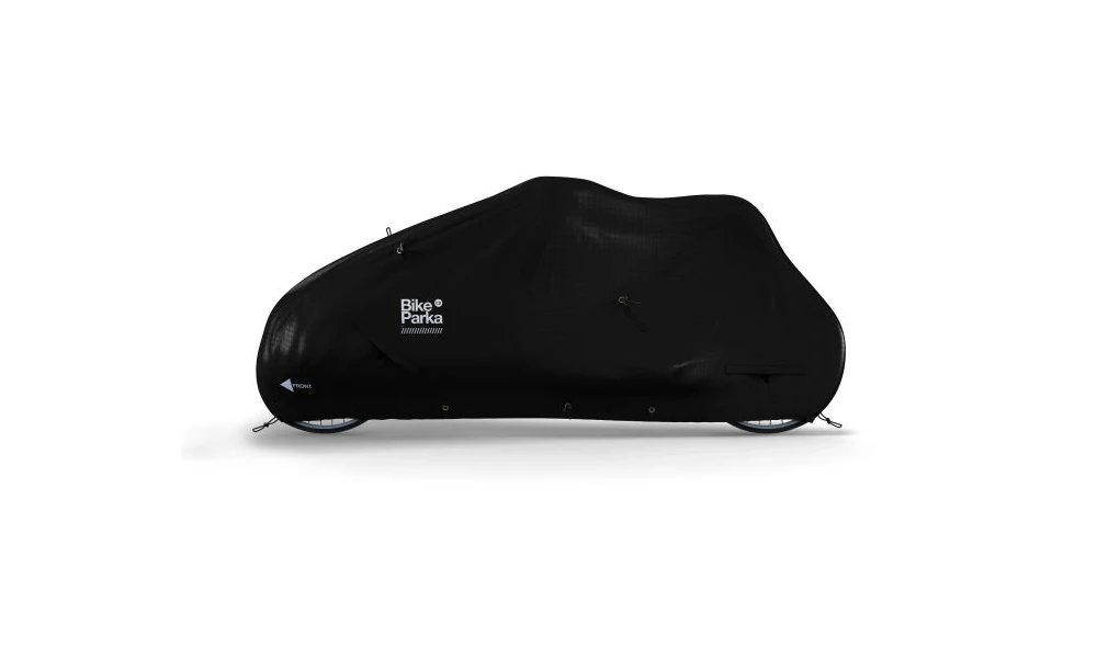 Jeder BikeParka sitzt auf allen Fahrrädern leicht anders, um verschiedene Rahmen, Lenker und Sitzhöhen zu erlauben. Um den BikeParka an Ihr Fahrrad anzupassen, legen Sie die Abdeckung zuerst unter das Vorderrad, und ziehen sie dann zurück über das Fahrrad. Danach können Sie den Knebel oben nutzen, um den BikeParka wenn nötig fester zu ziehen.