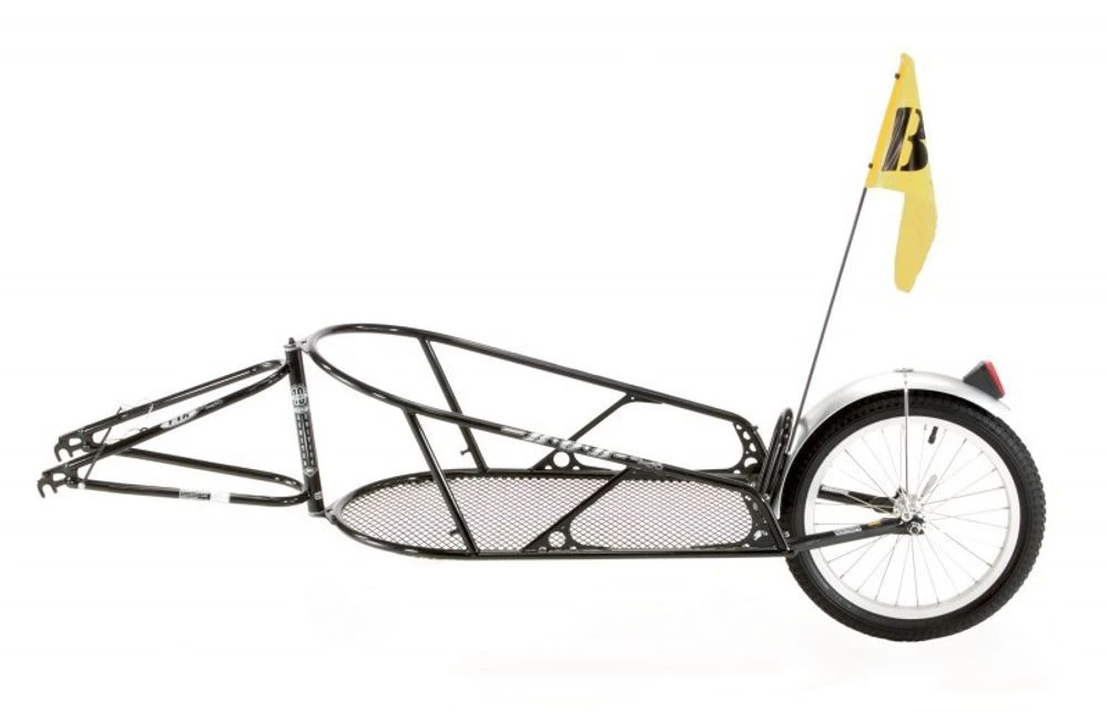Er wird mit einer Spezialaufnahme rechts und links an der Hinterradachse angehängt. Dadurch bleibt der Schwerpunkt tief. Das Drehgelenk hinter dem Hinterrad geht in jeder Kurve mit. Durch sein schmales Design kommt man mit dem BOB YAK überall durch. Sein leichtes Gewicht von 6,5 kg lässt auf Radtouren ein Gepäckvolumen von 30 kg zu.