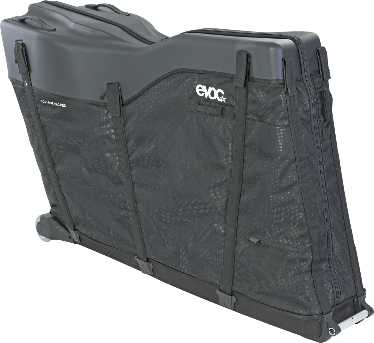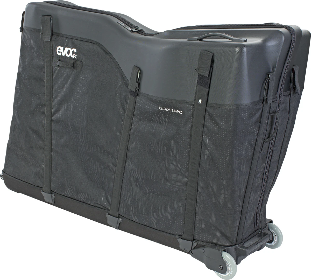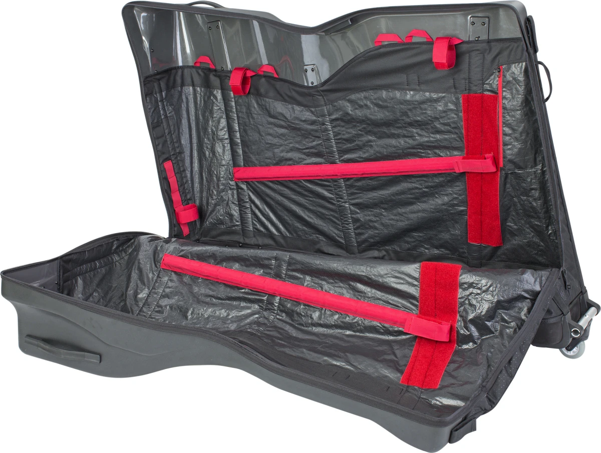 Rad-Reisetasche mit einer Hartschalen–Hybridkonstruktion in die individuell angepasste Renn– und Triathlonräder passen, ohne Cockpit oder Sattel verstellen zu müssen.