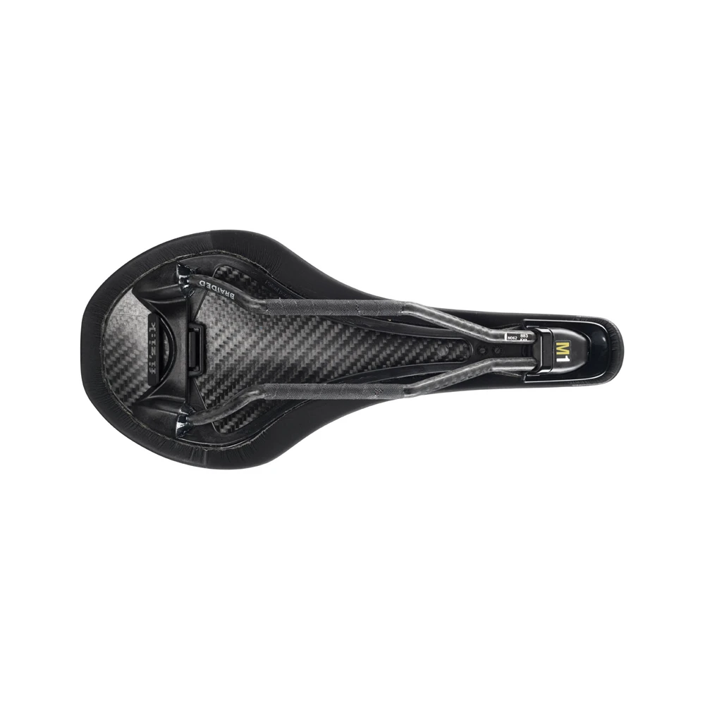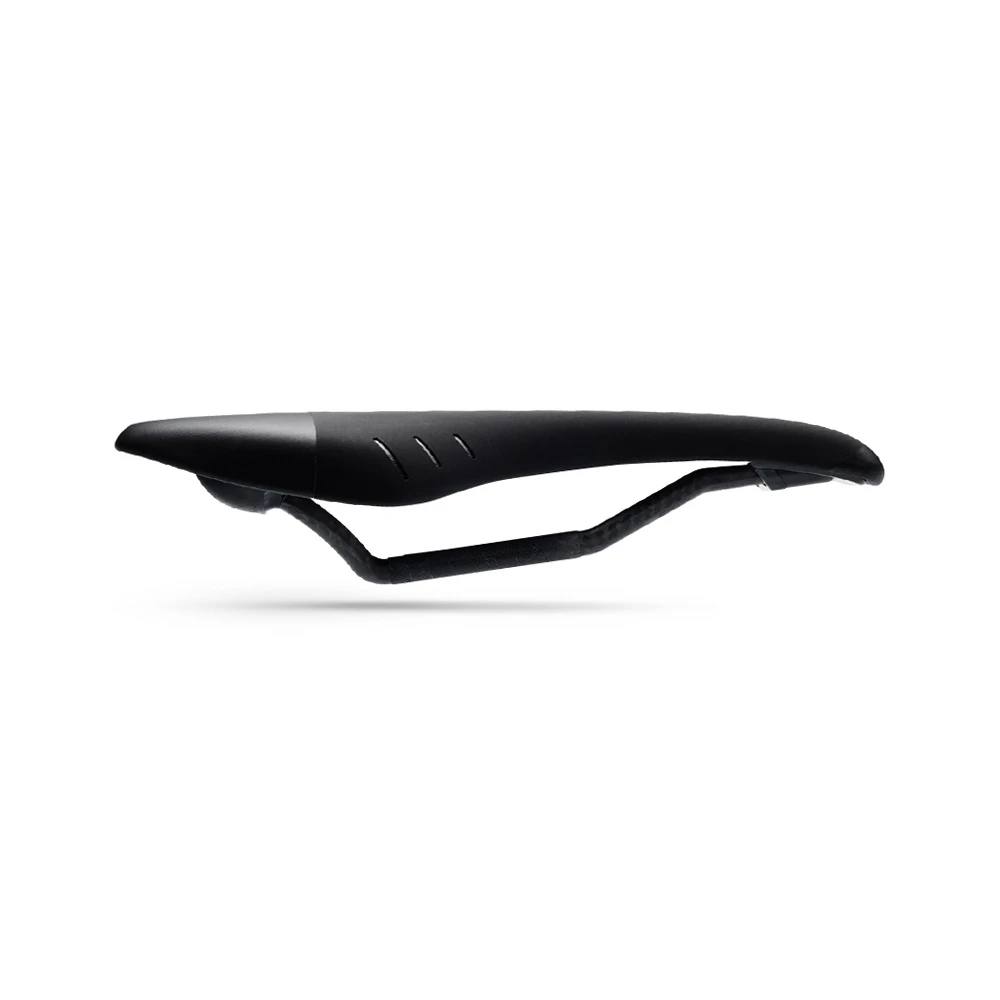Ein MTB XC-Sattel mit einer langen, flachen und schmalen Form, einer leichten Schale aus co-injiziertem Nylon und einem Carbon-Geflecht-Gestell, das viel Halt und Bewegungsfreiheit bietet.