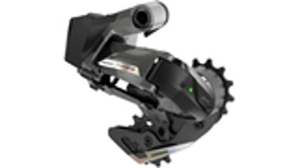 Straßenrennen. CX. Gravel. Coffee Rides. Dieses Schaltwerk macht wirklich alles mit und sieht dabei auch noch gut aus. Die einzige Käfiglänge funktioniert mit jeder Kassettengröße von 10-28 bis 10-36, in 1x oder 2x Konfigurationen. Das Schalten ist schnell und präzise, und der Orbit Flüssigkeitsdämpfer hält die Kette unter Kontrolle, egal ob das Hindernis ein Schlagloch oder eine Wurzel ist. Und das Dekor ist genau richtig, um dich daran zu erinnern, dass du den coolsten komplett über Funk betriebenen Antrieb auf dem Markt hast.