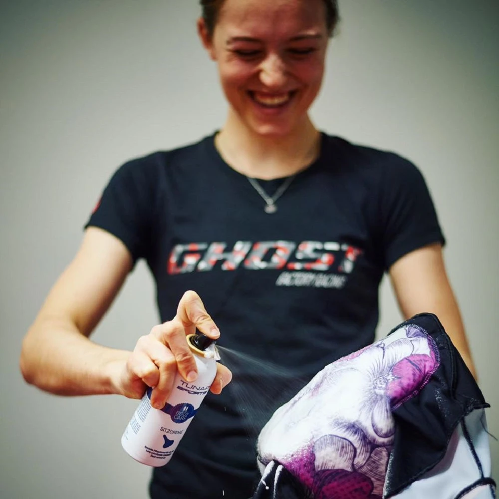 - Die Sitzcreme direkt auf das Hosenpolster sprühen. Alternativ: Die Sitzcreme in die Hand sprühen und am Gesäß verteilen