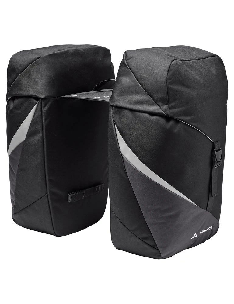 Vaude TwinRoadster bietet mit 4 eingearbeiteten Ösen auch die Möglichkeit, eines der gängigen Befestitungssysteme (Uniklip, MIK, Snap-it, Snap-it II, I-Rack) nachzurüsten. Die Taschen werden mit einem Haubendeckel verschlossen; der darunterliegende Staubalg ermöglicht die Komprimierung des Inhaltes. Schön ins Design integrierte Reflexelemente und die mitgelieferten Regenhüllen runden die Ausstattung dieser praktischen Doppel-Hinterradtasche aus 100 % recyceltem Polyester ab.